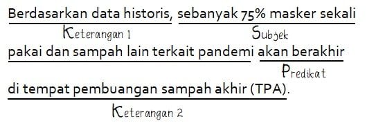 Kalimat 3 – Berdasarkan data historis, sebanyak 75% dari topeng sekali pakai dan limbah lain yang terkait dengan pandemi yang akan berakhir di lokasi pembuangan limbah akhir (TPA).